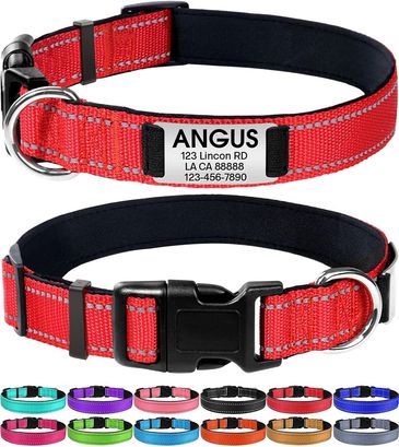 We like personalized collars because tags can get caught on objects and be pulled off of collars.